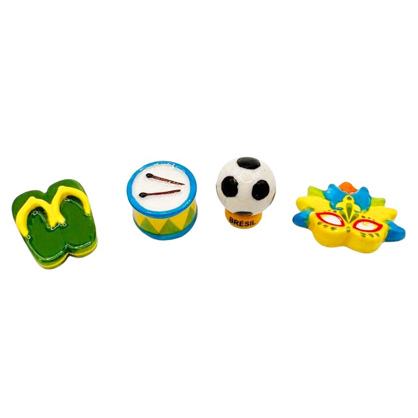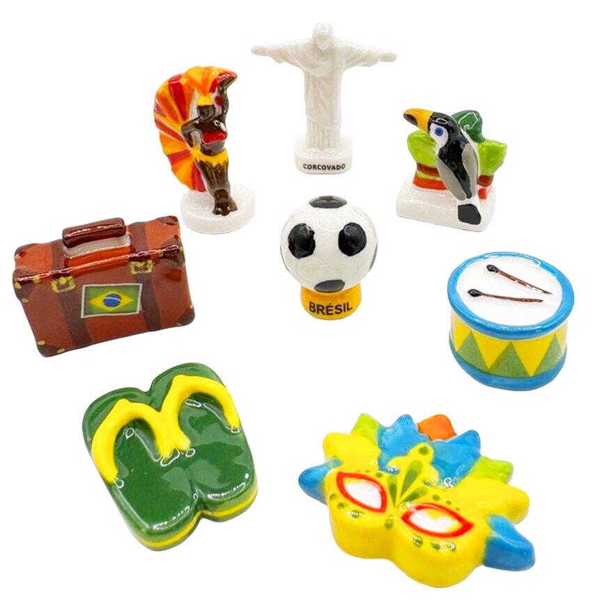 キリスト教、サンバダンサー、カーニバルのマスクや楽器、サッカー、動物、旅を連想させるアイテムなど、ブラジルを象徴するモチーフが多彩に揃っています。