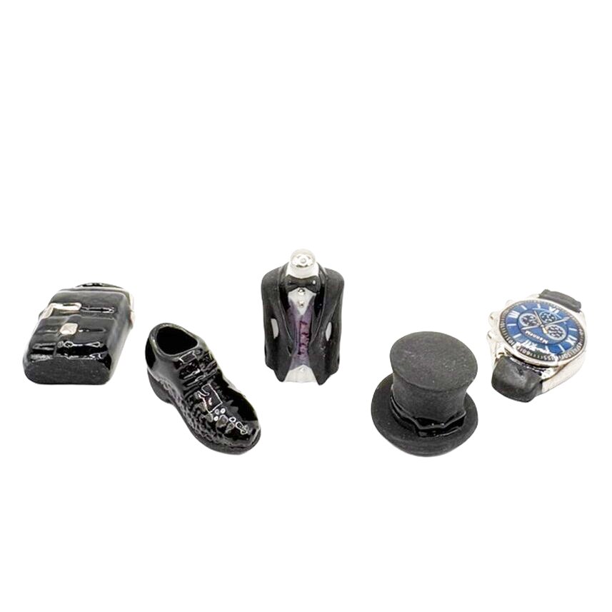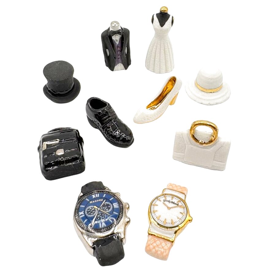 タキシードやドレス、靴、バッグ、腕時計、ハットなど、大人の装いを上品なモノトーンで表現しています。